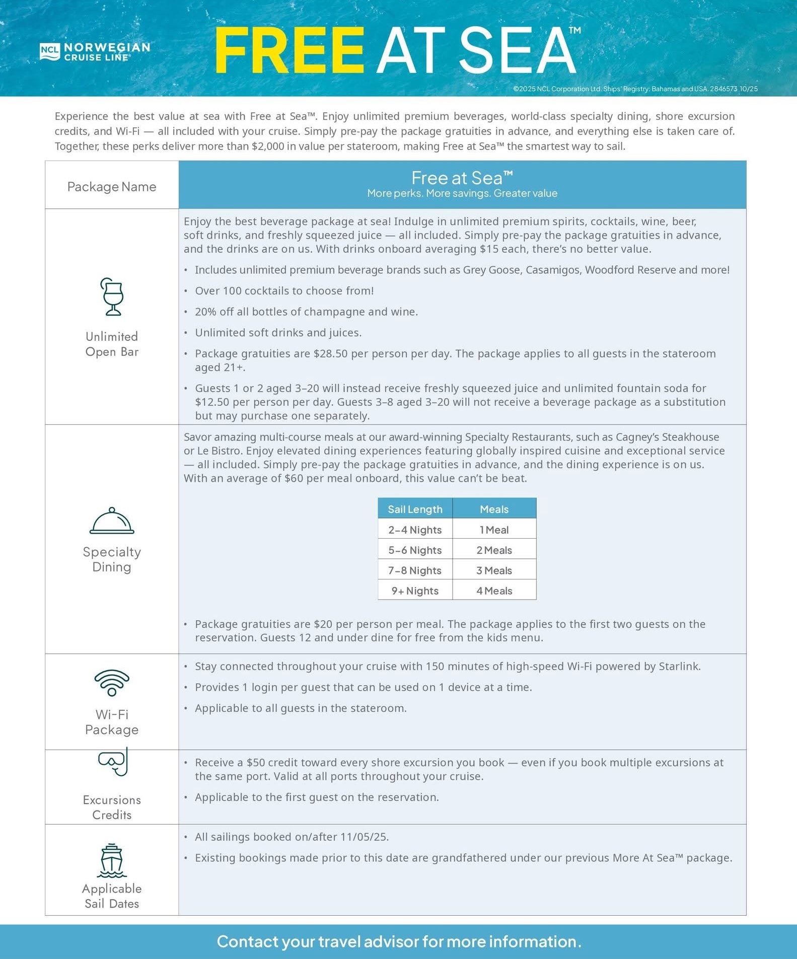 Yes. If you booked before November 5, 2025, your sailing is under the More at Sea program. You can contact NCL or your travel advisor to reprice your cruise to the new Free at Sea program if you’d prefer those terms.
